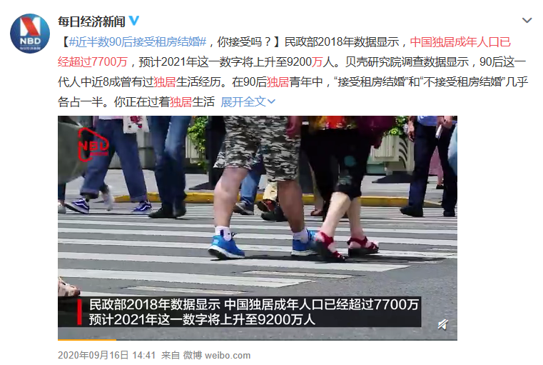 中国成年独居人口已经超过7700万。预计2021年,这一数字将上升至9200万人。