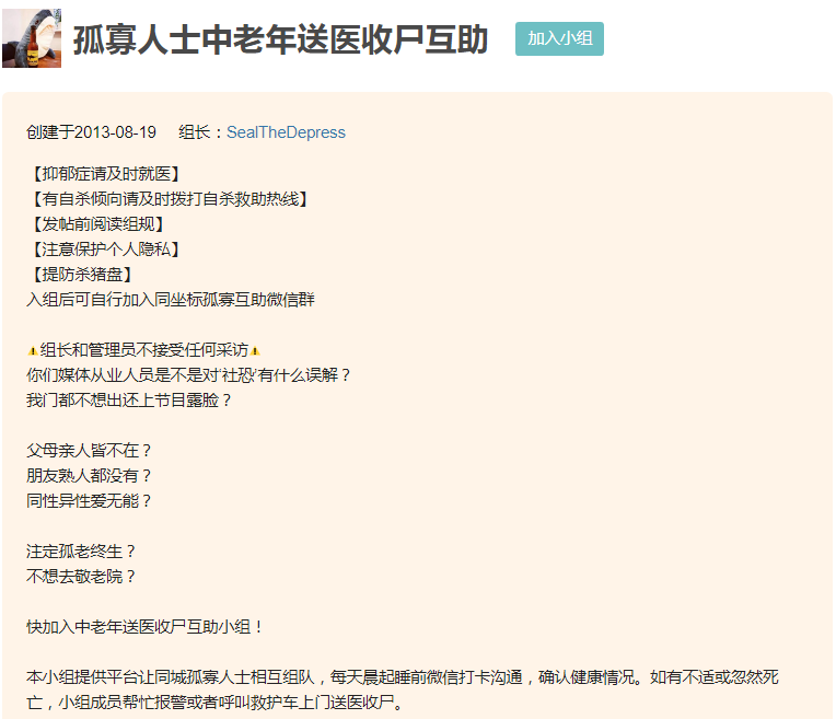 豆瓣上,有一个名为“孤寡人士中老年送医收尸互助”的小组。