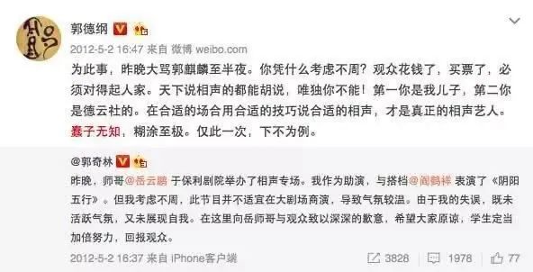郭德纲随后也转发了他的微博,并向观众道歉,他道歉语句中写到“蠢子无知,糊涂至极”。