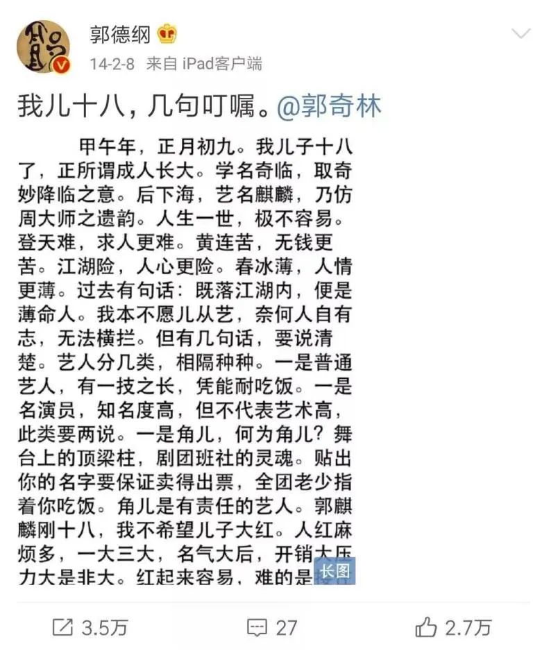 郭德纲在郭麒麟18岁生日时写给他的一封家书,流传甚广,其中的人生道理,丰富而隽永。