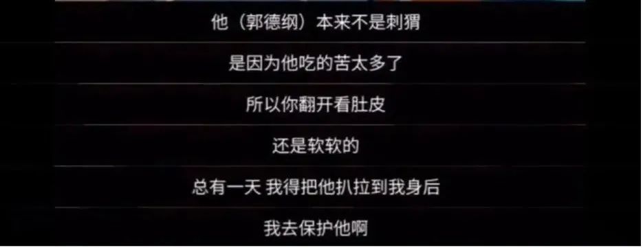 “他本来不是刺猬,是因为他吃的苦太多了,所以你翻开看肚皮,还是软软的。总有一天,我得把他扒拉到我身后,我去保护他啊。”