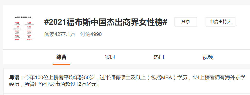 前几天,话题#2021福布斯中国杰出商界女性榜#登上微博热搜。