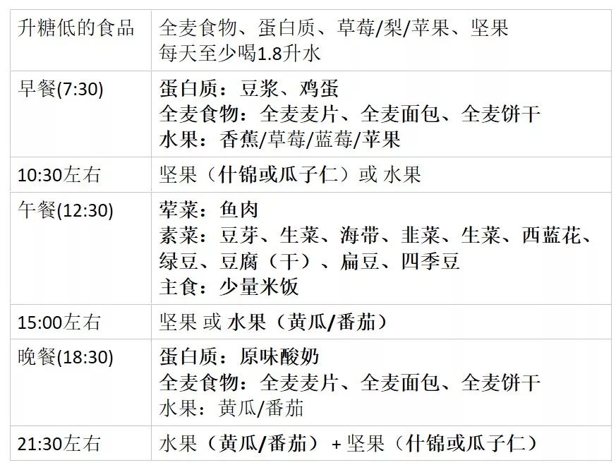 下图是我曾经坚持的食谱和进餐时间,供你参考。