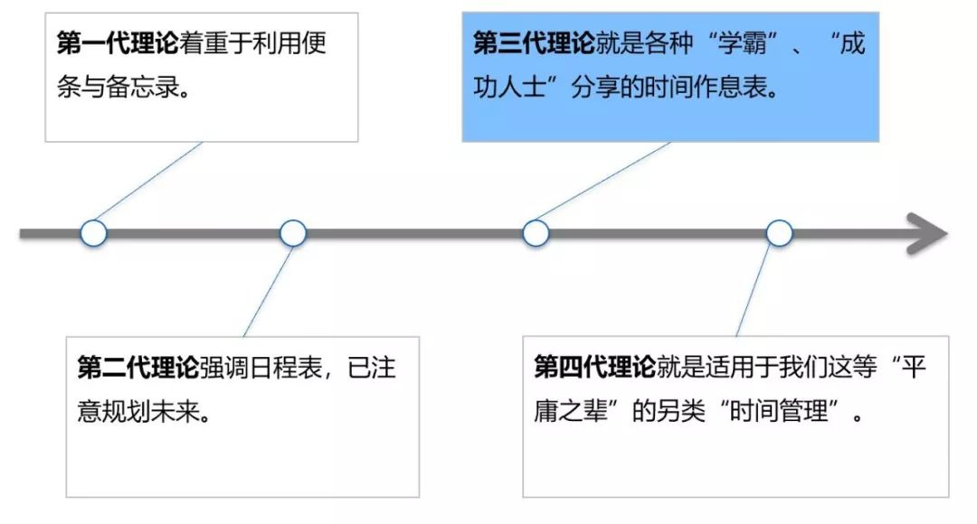 第四代时间管理理论从根本上否定“时间管理”这个名词,主张关键不在于时间管理,而在于个人管理。