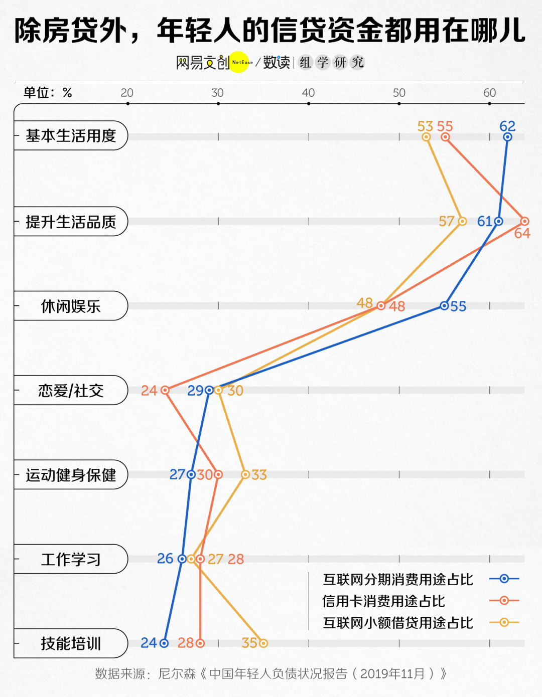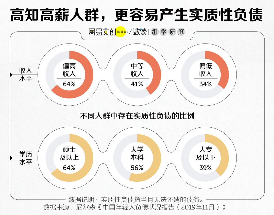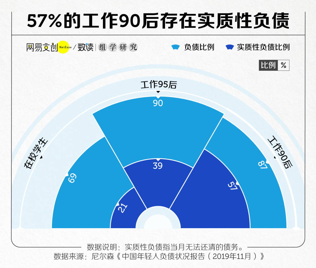 这些是豆瓣小组「负债者联盟」中随处可见的帖子,帖子里动辄金额上十万的负债,是发帖者焦虑与压力的来源。从发帖内容上看,“超前消费”“遭遇诈骗”“购车购房”“投资失败”等是他们背负债务的常见原因。网友们一边调侃“一入网贷深似海”,一边禁不住诱惑买买买,没钱还时只能以贷养贷,债务就这样越滚越大。在去年双十一前夜,「负债者联盟」冲进了微博热搜,之后它便频频出现在大家的视野中。目前,小组成员数量已经突破 3 万人。小组规模不断扩张的背后,是残酷的现实:这届年轻人已经开始负债了。根据尼尔森发布的《中国年轻人负债状况报告》,18 到 29 岁的年轻人中,有 86.6% 都在使用信贷产品,也就是说,只有 13.4% 的年轻人零负债。这么多年轻人用明天的钱,享今天的乐,听起来有点不靠谱,但真实情况并没有这么夸张。42.1% 的年轻人使用花呗、信用卡等信贷产品消费,并且在免息期内还清了债务,如果扣除掉这个比例,年轻人群体中实质性负债的比例是 44.5%。其中,工作 90 后实质性负债比例最高,为 57%,且远高于在校学生的 21% 和工作 95 后的 39%。有意思的是,许多负债的年轻人都有一个共同特征:学历高,挣得也多。高薪、高知的年轻人负债更多,并不意味着他们是陷入债务危机的主力军,他们有一定的偿还能力,对未来更有信心,也更倾向于负债消费。负债也并非就是万恶之源,对负债的合理利用,可以让一些人充分的利用资金的时间价值,有人摆脱了困局,有人赚到了更多的钱。当然,这里有个重要的前提——“合理”。「负债者联盟」之所以能戳中大家的痛点,问题就在于不合理的负债让局面失控,这些负债者的生活正在步入深渊。和已经成家立业的中年人不同,房贷对于年轻人负债率的影响有限。还贷的压力比闹钟好使,不过初入社会,大部分年轻人还没钱或者没资格买房。于是,借来的钱大都花在了“买买买”上。互联网分期消费和信用卡是年轻人最常用的两种信贷产品,他们月收入的 30.6% 都要用来偿还这些借款。和信用卡相比,互联网分期产品虽然额度小,但用起来方便,不需要年费,申请门槛也更宽松,在年轻人中的渗透率明显更高。满足基本生活用度、提升生活品质和休闲娱乐,是他们使用信贷产品的主要消费用途,正是这些看似很平常的消费,让他们背上了债务的大山。超市买包零食、水果摊付个水果、再到买件衣服和球鞋……用花呗等互联网分期产品付个款,感觉也没花什么钱,但积少成多,甚至开始超前消费,就可能把控不住了。「负债者联盟」小组中有不少这样的例子:一开始为了自己喜欢的某件商品没忍住大手大脚花钱,把钱不当数,之后越陷越深:2016 年到手收入是 60000/年,借款让我陆陆续续有了与收入不匹配的护肤品、衣物、iPad,2017 年中负债 5-6 万……难以容忍生活品质下降,又没有额外增加的收入,结果就是 2020 年底负债 282,386.43。
