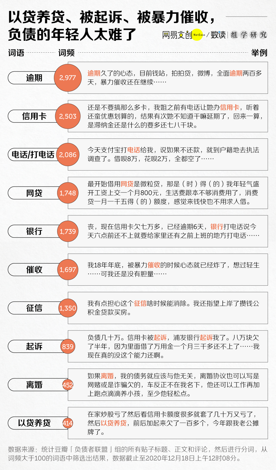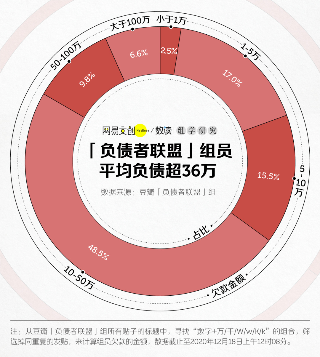 有人野心勃勃投资期货,从亏损到几轮补仓,最终负债 74 万元。还有人在出车祸后心情郁闷,在音乐平台与网友聊天解闷,越聊越投机,却不料对方是骗子,从此陷入了“杀猪盘”,被骗取了 13 万元,无奈加入「负债者联盟」诉苦。欠债原因各不相同,但欠债的结果往往只有两个:要么还钱,要么毁灭。我们统计了「负债者联盟」小组成员的负债情况,仅仅从发帖的标题显示的金额来看,组员平均的欠款金额达到了惊人的 36.7 万元。这个数据可能受到了一些极端数据的影响,但从中位数来看,平均欠款也达到了 16 万元,大多数成员的欠款数额在 10 - 50 万元之间。刚开始的欠钱数目可能只是一个小窟窿,一旦失控,只得拆了西墙补东墙,最终债台高筑。借贷平台上的“逾期”每天都在新增计数,数字越来越大,心理的压力也越来越大,在「负债者联盟」组内的帖子中,“焦虑”“压力”“可怕”等表示负面情绪的词汇屡见不鲜。无法填满的债务就像驾驶一辆马车,一旦失控就很难回到正轨。网贷平台的催收手段五花八门,连续不断的电话往往是第一步。还不上钱,不少催债公司会开始“爆通讯录”,找到负债人亲朋好友以及同事领导的电话,让他们催负债人还钱,甚至对你“暴力催收”:昨天催收打电话给了两个朋友,今天接到电话说要寄材料到公司和户籍地。唉,自己挖的坑,现在开始承受吧。做好了爆通讯录的打算,真爆了通讯录就干脆拖着了,先把欠朋友的钱还上。