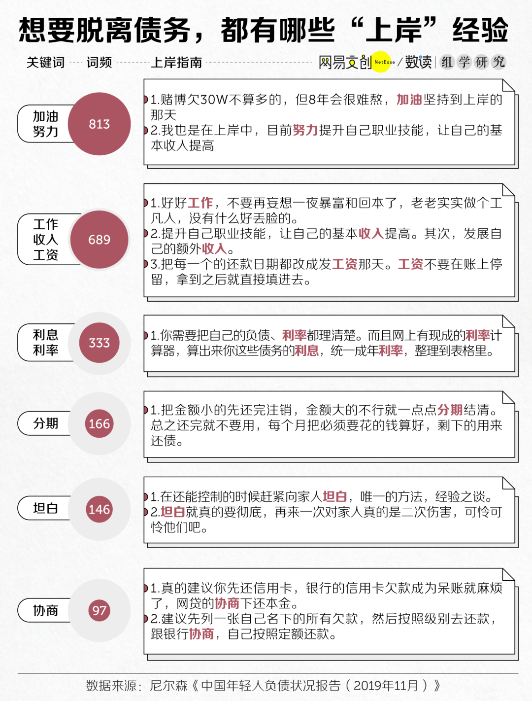 或是被消费的欲望冲昏头脑,或是被生活的不幸拖入深渊,不管负债失控的原因如何,不论负债多少,正视自己的债务问题,并开始上岸之路,这是一个好的开始。每当有组员成功上岸,「负债者联盟」的成员都不吝称赞,回复中充满了“恭喜”和“替你开心”。同病相怜的组员们,往往能更好地帮助负债者重新规划生活。而上岸者的现身说法,给负债者增添了信心。在金庸的武侠小说中,大侠跌落峡谷,往往能得到高人相助,最终练成神功。然而对于跌落负债深谷的人,「负债者联盟」也可以是一个宣泄情绪、寻求经验的平台。有的人痛定思痛重新出发,但不是每个人都这么幸运,有些人可能永远就留在了谷底,直到负债的浪潮将他彻底席卷。● 作者:网易数读。本文来源于:网易数读(ID:mbalib)。MBA智库(mbalib)经授权发布本文,转载请联系原作者。