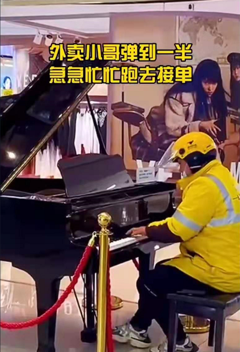 这位小哥趁着取外卖的间隙,来到商场中央的钢琴前,送餐奔波的疲倦使他肩背屈伏,却无损他指间琴声的灵动。
