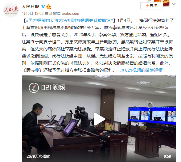 1月4日,上海闵行法院宣判了上海首例适用《民法典》新规撤销婚姻关系案。而这起案件引发的讨论,也迅速霸屏。
