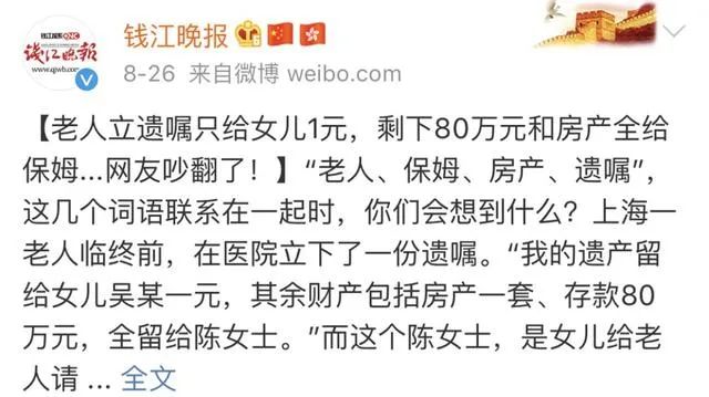 2018年11月25日,上海一位老人在临终前立下了一份遗嘱: