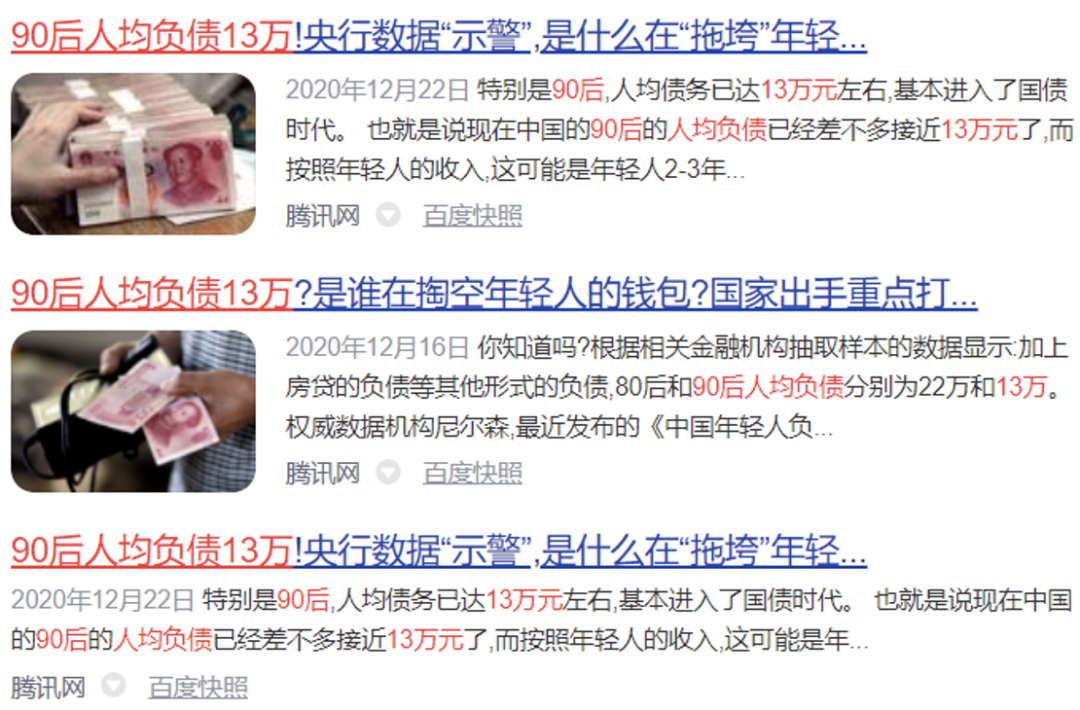 第二则,是关于90后负债。央行一个报告显示:90后人均负债已达13万元,中国35岁以下的年轻一代,有56%的人还未开始储蓄。