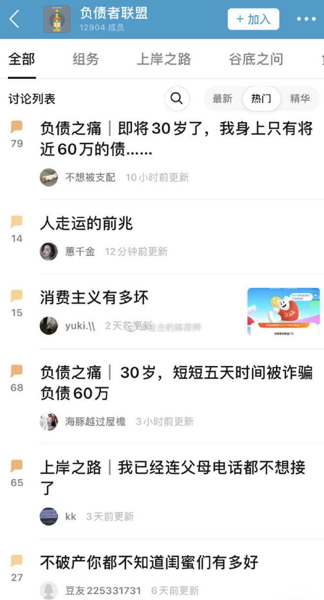 第一则,是关于负债者联盟。豆瓣上有一个“负债者联盟”,这个才创建一年多的小组,已经集结了3万多名成员,其中大都是因借贷欠债的年轻人。