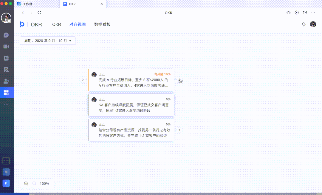 在一家行业头部地产客户公司,员工时刻「关注」领导和同事的 OKR调整 ,用「对齐视图」和协作者对齐目标;到了复杂的项目预算环节,分工安排到人,一个「@」实时通知到位,部门内和跨部门都能够共享上下文;每旬回顾开发进展,直接在线上更新记录进度里程碑,确保每一件事形成闭环;月度总结直接借助可视化数据看板,通过权重和打分数据复盘全周期 OKR 执行情况。