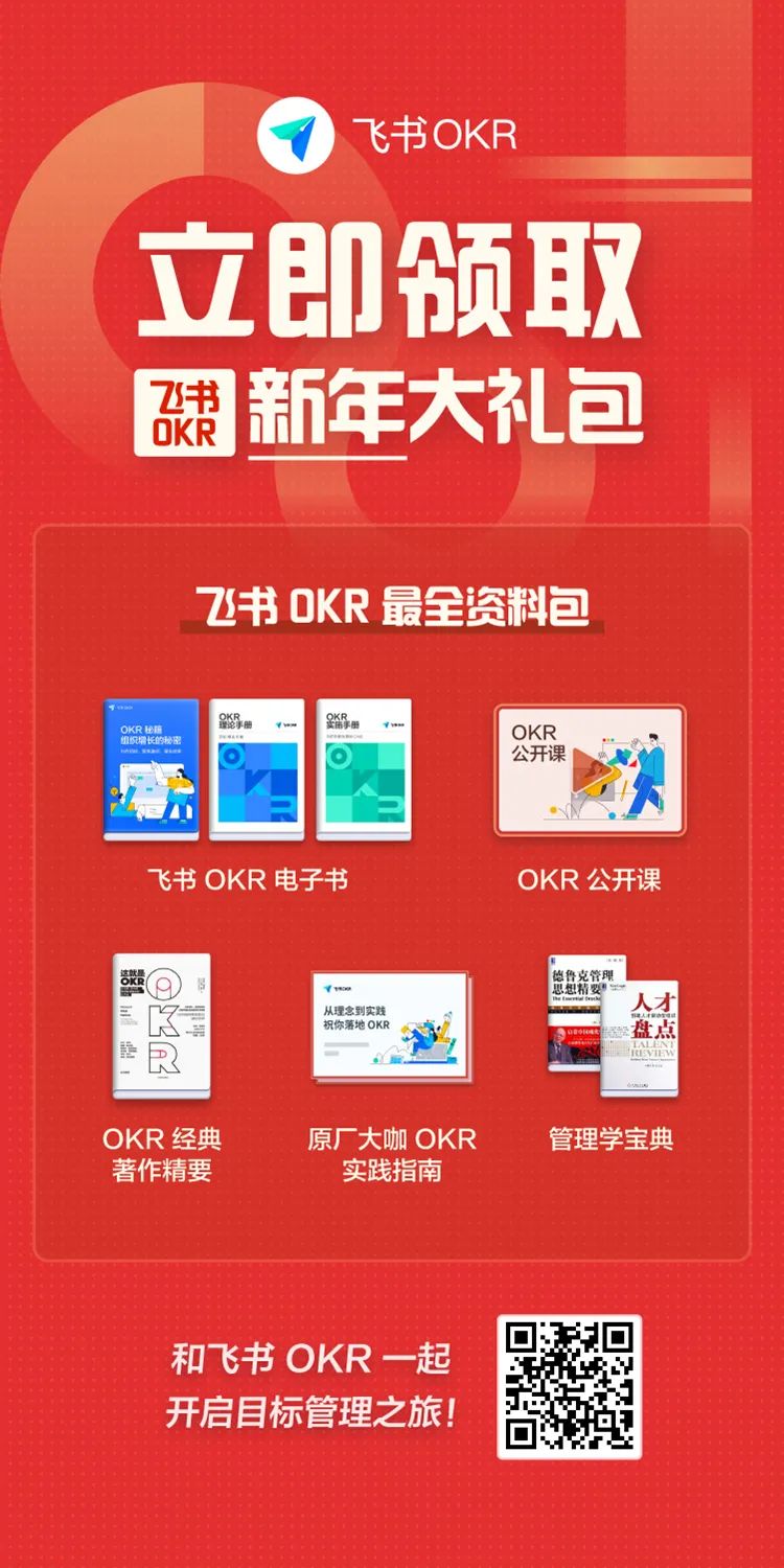在这失控时代,CEO 要保持清醒的头脑,用高屋建瓴的眼光,洞察企业的发展潜力,才能更有序更快地赋能企业的发展!说了这么多 OKR 的使用方法,这里为大家准备了 飞书 OKR 新年大礼包,欢迎大家扫码下载,获取更多 OKR 的知识!