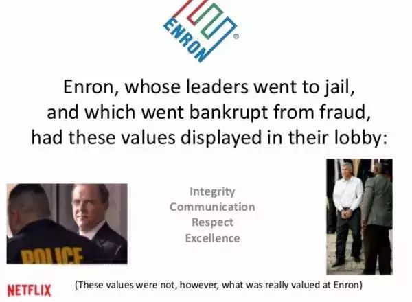 安然公司,高层入狱,公司因欺诈而破产,在它的大堂里展示着这些企业价值观:正直、沟通、尊重、卓越。(这些字眼并非是安然公司真正的价值观)