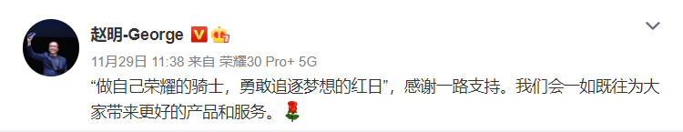 时至今日,唯一算得上是回应的就是任总讲话当天,赵明微博里的一句歌词,还有网传他在荣耀内部“打倒华为”的口号。