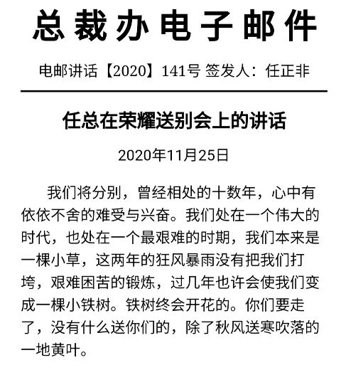 11月25日,任正非在荣耀送别会上的讲话感动了无数人。