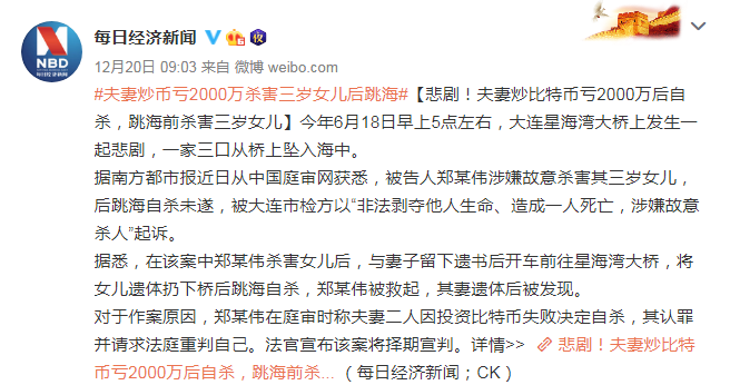 1.《悲剧!夫妻炒比特币亏2000万后自杀,跳海前杀害三岁女儿》,来源:新浪财经;