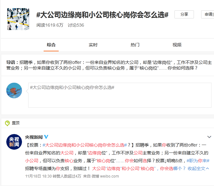 “正处招聘季,如果你收到了两份offer:一份来自大公司,工作内容不涉及主营业务;另一份来自负责核心业务的小公司,你会考虑去哪一家?”