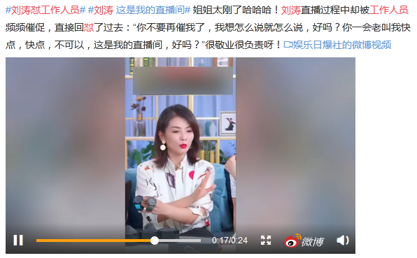 多次被催促后,刘涛终于忍不住了,转过头对工作人员说:“你不要再催我了,你老叫我快点、快点,不可以,这是我的直播间,好吗?”随即又回到镜头前,继续微笑着给观众介绍产品。