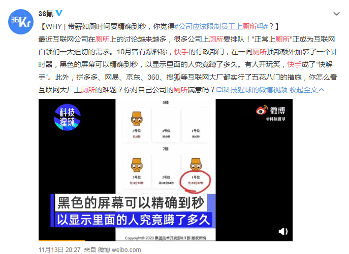不久前,有网友曝快手总部在洗手间内安装计时器,“限制员工带薪拉屎”。