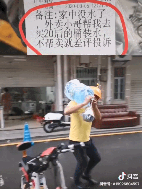 抖音里有位外卖小哥,在一个视频里说:“我向生活低头了。”引起了我的注意。事情的起因是顾客在订单上备注着:“家中没水了,外卖小哥帮我去买20L的桶装水,不帮买就差评投诉。”