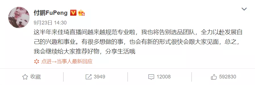 前不久,李佳琦的“小助理”付鹏,发文正式告别李佳琦选品团队,全力发展自己的事业。