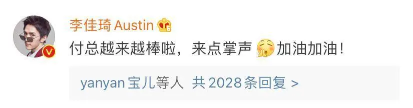 作为昔日搭档李佳琦大方地送上祝福:“付总越来越棒...”