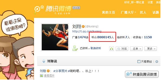 2010年12月,刘翔的腾讯微博听众人数突破800万,成为全球第一微博。