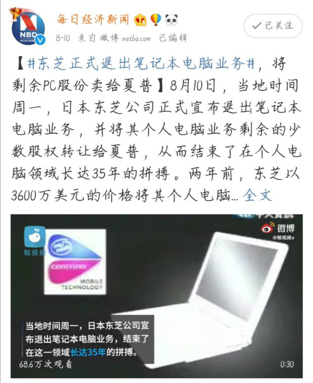 8月10日,#东芝正式退出笔记本电脑业务#上了微博热搜。日本东芝公司正式宣布退出笔记本电脑业务,结束了其在个人电脑领域长达35年的拼搏。