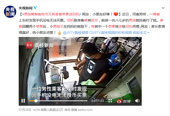 男乘客为了表示感谢,回赠了孩子两个苹果。
