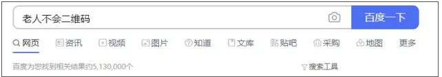 在百度上搜索“老人不会二维码”的关键字,得到的相关结果有5130000个。