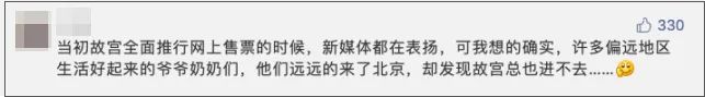 有一个网友说的很好:当初故宫全面推行网上售票,却忘了考虑当那些偏远地区的爷爷奶奶们,终于来到他们心心念念的北京故宫,却发现,那堵红墙怎么也进不去。