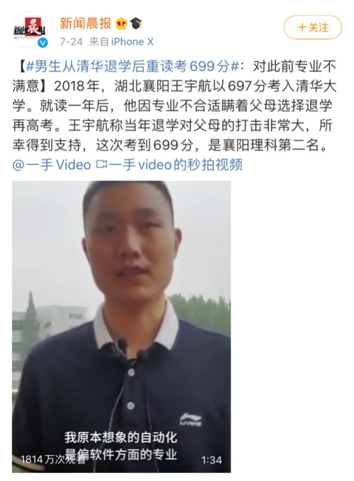 在又一批高中生即将面临成年后第一个选择,步入大学校园的时候,王宇航的经历可谓标杆。
