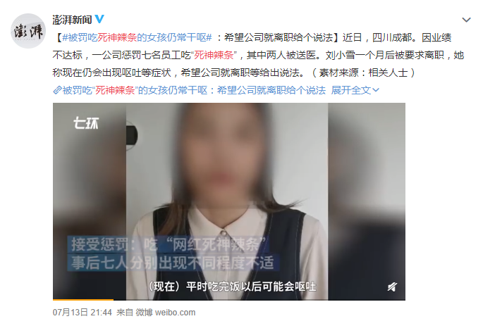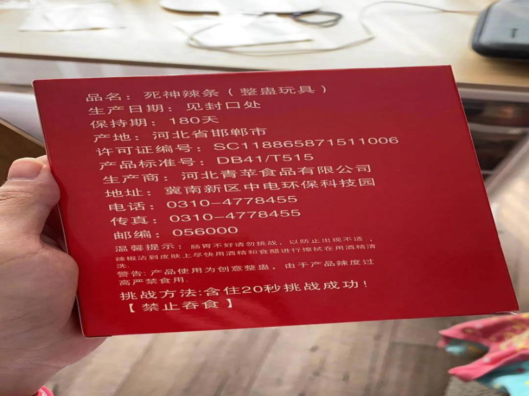 事后据刘小雪表示,她自己的业绩是达标的,只是部门业绩没有达标,部门一共9个人,2个是领导,其余7个人每个人都要吃两包“死神辣条”,而且要求要吞食。
