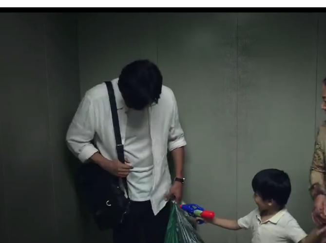电梯里,小朋友拿着水枪玩,每次都会洒得他裤子一片湿,但他依然每次都会喜怒不形于色,一句呵斥的话也没有;