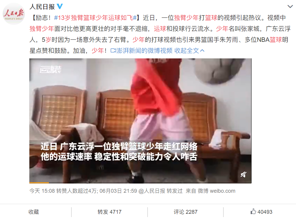 14岁的广东云浮独臂男孩张家城这两天因为一个视频走红,视频中,球场上的张家诚面对着高大健全的对手丝毫没有感到怯懦。