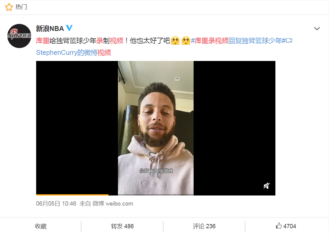 张家诚的抖音粉丝在这几天涨到了66.9万,NBA球星库里也被他的视频所打动,隔空喊话要找这个男孩,并且为他录了一只视频,告诉他:“你是正能量,告诉所有认为你无法做到的人,你可以,而且你可以做得很好。”