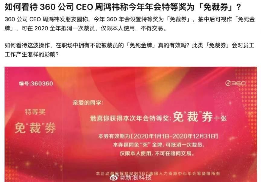 每到年底,总会有各种跟年终奖和年会有关的奇葩新闻让人大跌眼镜。前两天,360年会大奖是“免裁券”的新闻,更是刷新了职场人对年终奖的认知。但很快,机智的网友就发现,这张免死金牌,其实和废止无异,因为券只能用一次,但裁员却可以有很多次。从往年的无底线表演,到如今的和员工斗智斗勇,年会,已经在逼疯职场人的路上,越走越远。
