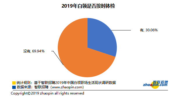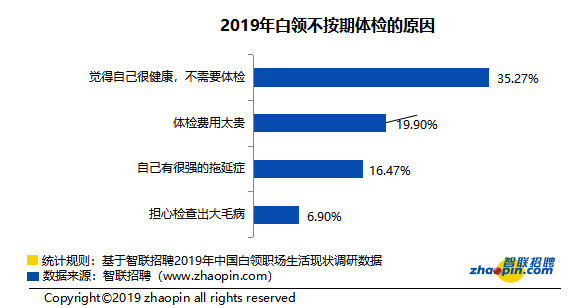 在《智联招聘2019年白领生活状况调研报告》中显示,有近七成的职场人没有按时体检,在被问及不体检的原因时,35.27%的白领觉得自己很健康,19.90%认为体检的费用太贵,16.47%输给了拖延症。为此,建议你可以从每月网购的钱里,拿出一部分,到正规专业的医院或者体检中心给自己做次体检!记住不要怕花钱,定期体检给自己买个心安,也是给自己身体的一个交代!