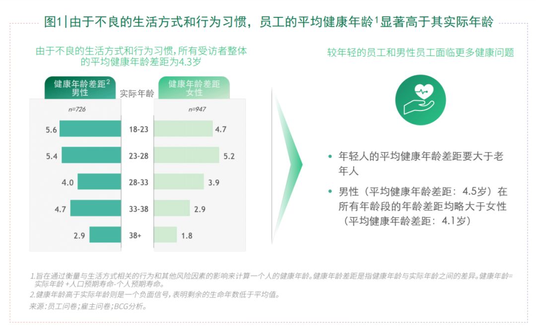 根据平安健康险联合波士顿咨询公司推出《中国企业员工洞察报告2019》显示,我国在岗员工的总体平均年龄差距为4.3,这意味着,基于他们的生活方式,员工的预期寿命将比整体国民的平均寿命要短4.3岁。