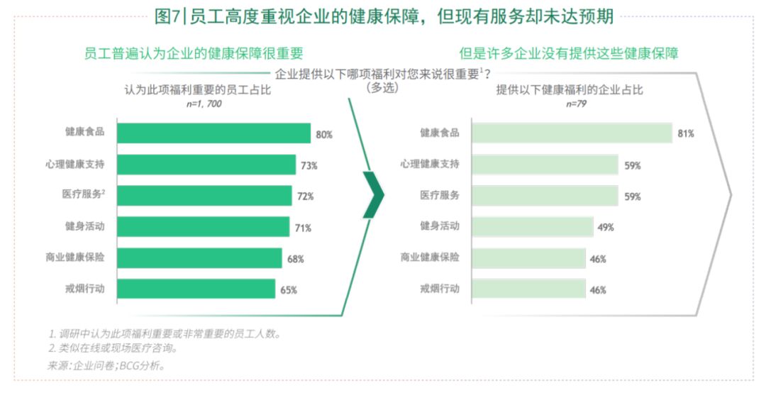 就调查数据来看,有70%的员工认为雇主的健康保障很重要,这其中包括了健康的食品、医疗服务、体育锻炼、商业保险以及心理支持等,然而目前雇主的服务水平却不令人满意: