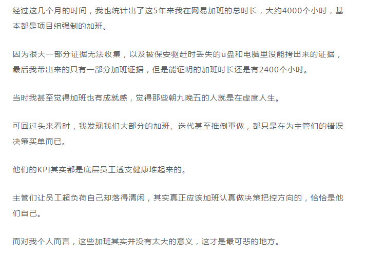 该员工称:2014年进入网易工作,5年来兢兢业业,加班时间超过4000小时,累出重病后,却被无情地扫地出门,甚至连应有的赔偿,公司都想赖掉。