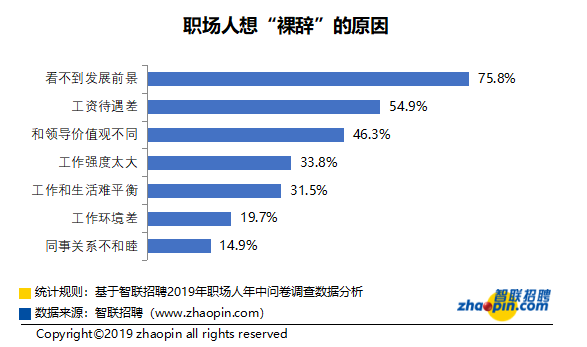 在智联招聘公布的《2019职场人年终盘点报告》中,90.4%的职场人上半年都有过“裸辞”的念头,其中,38.8%的人认为“工作强度太大”,31.5%的人认为“工作和生活难以平衡”是想“裸辞”的主要原因。