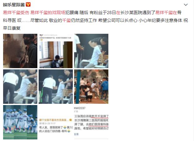 网上曾经曝光过一组易烊千玺在拍摄现场,腰部不适,助理在旁边为其揉腰的照片,并有粉丝在骨科医院偶遇他。