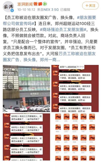 前两天,郑州的一个网友反映,自己工作的商场,强制要求员工发朋友圈、换头像来宣传,否则,就要被扣工资。