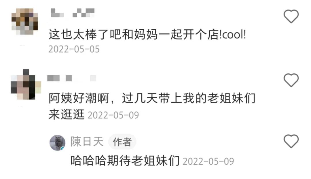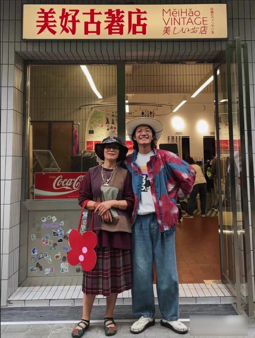 出名要趁早,创业也是。当同龄人还窝在寝室时,我在进入浙江理工大学的第一年,创立了复古服饰品牌PROS BY CH,那年我19岁。同时作为美好商店的联合创始人,我和朋友在杭州先后开了3家「美好古着店」。2021年,我身上的标签发生了改变,从「创业者」到被母校聘为创业导师。记得我上小学时,我妈开了家服装店「爱爱服饰」,大家都叫她爱姐。看似不瘟不火的小店,居然奇迹般开到了我大学毕业,还给了我第一笔创业资金3万元。作为有着「会赚钱」滤镜的义乌人,现在打理的品牌年收入达百万,我想多少还是有爱姐创业的影子存在。老实说,我不是一个「乖孩子」。从小在爱姐复古、夸张装扮的熏陶下,我也开始追求小众又个性的审美,变身「潮二代」。初中时,我在YOHO杂志上接触到潮流文化,那时逐渐有了创立自己品牌的想法。大四那年,为了专心创业,我果断决定休学。偶然间在泰国的市集上,我淘到一件海军甲板服,被老板珍藏了20年之久,岁月的痕迹真令人着迷。2016年杭州的古着店还很少见,我和现在的合伙人一拍即合,第一家「美好古着店」就开在了大学城附近。后来又去了日本、韩国、美国等国家,我越了解越「上头」,古着文化其实非常丰富,我可以学习一辈子。去年我把爸妈接来杭州安度晚年,可做了半辈子老板娘的爱姐哪里闲得住,我就「聘请」她去下沙的古着店看店,负责收银、导购、整理打扫等,继续她热爱的服装事业。爱姐快60岁了,算是退休人员再就业,我按照店员的标准,每月6000元给她发工资,不过她也不是很在意(笑)。2022年5月,美好古着店迎来疫情后的重新开店,我突然有了记录和爱姐开店日常的想法。印象中爱姐的那家小店只有50平米左右,对我来说更像一个周末学完画画休息的中转站,记忆都有些模糊了。而开店日记的初衷,就像「美好古着店」的名字一样,收集美好的人和美好的事物吧。这几年疫情对实体店的冲击太大了,古着店能「活下去」还得靠线上售卖,这对于习惯了手写输入和超大字体显示的爱姐不太友好。每天我也会抽出点时间,教爱姐使用出入库系统、打印衣服标签、对镜自拍等,包括用店里的蓝牙音响播放音乐这些,基本上教个两三遍爱姐就能学会。最让我觉得意外之喜的是,爱姐做了几十年服装生意,尤其在销售上是个老手。不像有些店员木头一样就会跟在顾客身后,爱姐靠着闲聊家常拉了一波好感,态度好更是必杀技,有些粉丝还特意跑来向我「表扬」爱姐。活在现代世界里却喜欢和老旧事物打交道,我和爱姐都是这样的人。在我的镜头下,爱姐跨年龄段的穿搭展示,极具反差感。在穿搭这件事情上,爱姐很有自己的想法,NIKE古着冲锋衣搭配remake改制系列 ,红色也穿出了潮酷的感觉,大家都知道美好古着店里有个「酷阿姨」。从没想过有一天,我会和爱姐成为同事,这段经历简直可以用「奇妙」来形容。早上和爱姐吃完早餐后,送她去店里,帮她搭配衣服、拍视频,到了中午品尝爱姐亲手做的便当,再开车去公司,下班后去店里接爱姐一起回家。不再是从家到公司两点一线的生活,我随着爱姐的脚步慢了下来,忙碌中留有一丝松弛。或许是蓄谋已久,最近爱姐有了重启「爱爱服饰」的念头,总和我念叨要开店这件事。我看得出来爱姐认真了,她还是更喜欢原来店铺的风格,那些老顾客也让她念念不忘。当我还在可惜(不一起开店)的时候,一生要强的爱姐已经在义乌看店铺了,不愧是行动派。