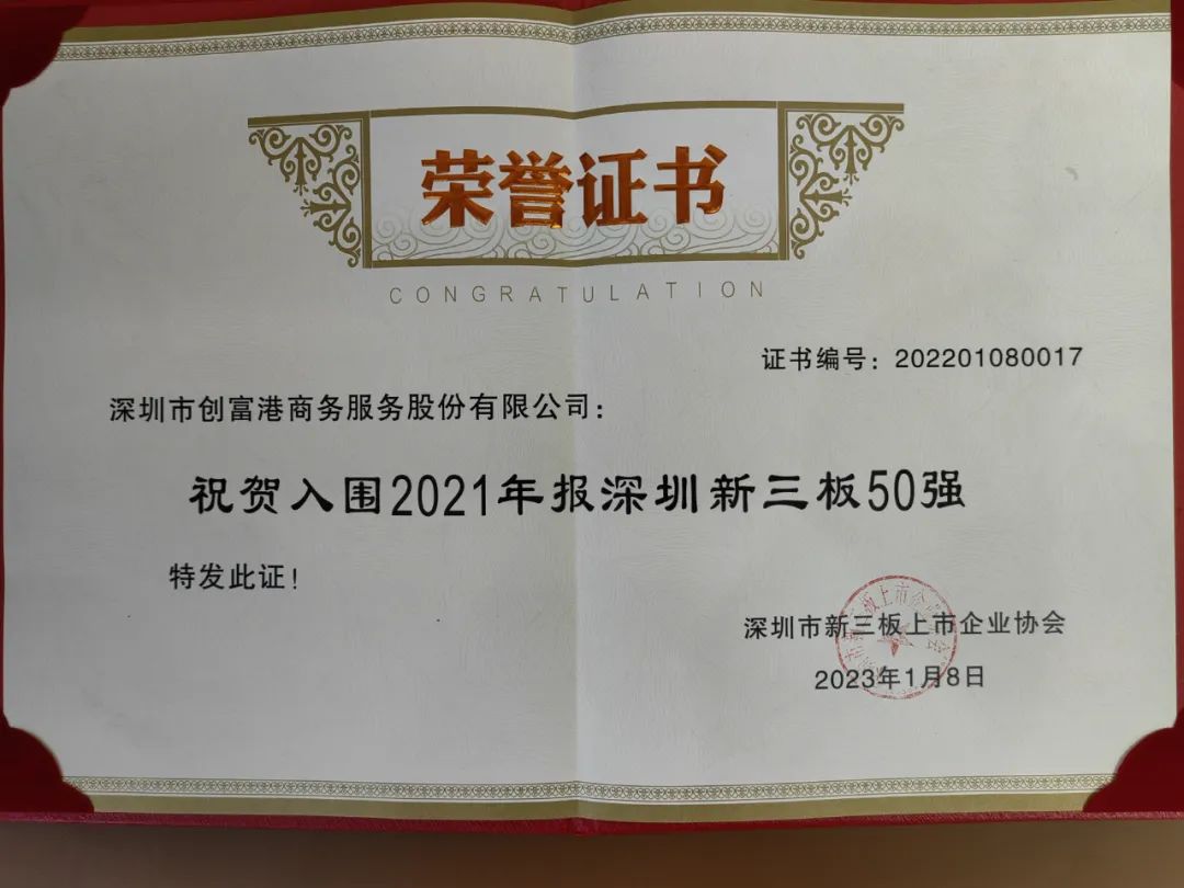 2023年1月8日,第四届深圳新三板50强高峰论坛在深圳市福田区大中华喜来登酒店隆重举行。本届论坛由深圳市新三板上市企业协会与深圳市昌顺食品集团共同主办,中小企业合作发展促进中心联合主办,品牌中国栏目组协办。在深圳新三板50强授牌仪式上,创富港(股票代码:836090)再次凭借强大的综合实力和良好的经济收益脱颖而出,成功入围2021年报深圳新三板50强,这已经是创富港连续三届获此荣誉了。