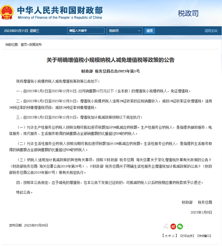 一、自2023年1月1日至2023年12月31日,对月销售额10万元以下(含本数)的增值税小规模纳税人,免征增值税。 二、自2023年1月1日至2023年12月31日,增值税小规模纳税人适用3%征收率的应税销售收入,减按1%征收率征收增值税;适用3%预征率的预缴增值税项目,减按1%预征率预缴增值税。 三、自2023年1月1日至2023年12月31日,增值税加计抵减政策按照以下规定执行: (一)允许生产性服务业纳税人按照当期可抵扣进项税额加计5%抵减应纳税额。生产性服务业纳税人,是指提供邮政服务、电信服务、现代服务、生活服务取得的销售额占全部销售额的比重超过50%的纳税人。 (二)允许生活性服务业纳税人按照当期可抵扣进项税额加计10%抵减应纳税额。生活性服务业纳税人,是指提供生活服务取得的销售额占全部销售额的比重超过50%的纳税人。 (三)纳税人适用加计抵减政策的其他有关事项,按照《财政部 税务总局 海关总署关于深化增值税改革有关政策的公告》(财政部税务总局 海关总署公告2019年第39号)、《财政部 税务总局关于明确生活性服务业增值税加计抵减政策的公告》(财政部税务总局公告2019年第87号)等有关规定执行。 四、按照本公告规定,应予减免的增值税,在本公告下发前已征收的,可抵减纳税人以后纳税期应缴纳税款或予以退还。