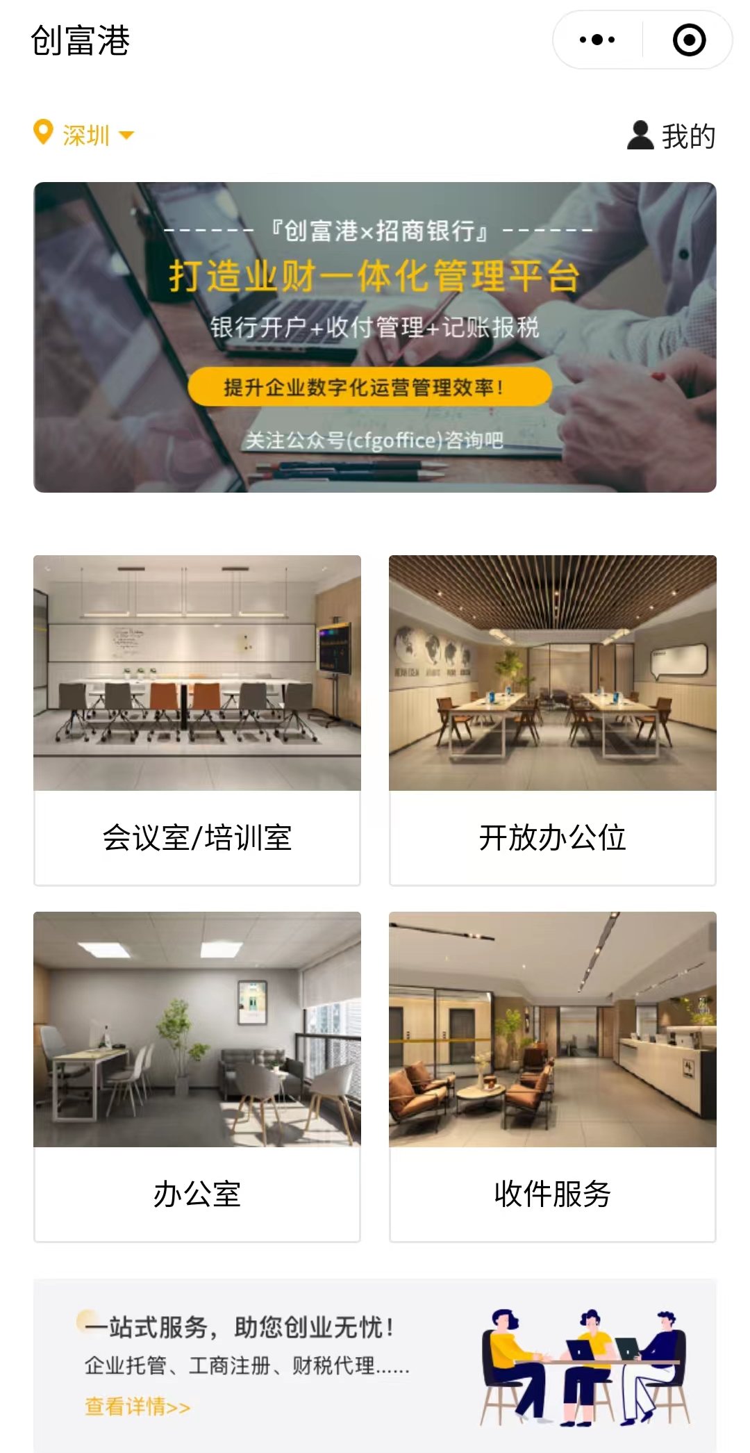 为给创业者提供更高效更便捷的办公服务,提高办公效率,创富港推广使用“创富港办公室出租”小程序,赋予智能移动办公新定义。作为专为创业者与中小微企业设计的服务平台,“创富港办公室出租”小程序实用又轻便,不受空间时间限制,无需安装和卸载,通过搜索或扫描二维码,即可使用。“创富港办公室出租”小程序同一后台统一管理,预定会议室/培训室、卡位、参观办公室、收件服务等功能轻松实现。这意味着,用户只要动动手指就可以解锁创富港联合办公空间,在更加智能化和人性化的空间里,沉浸式体验未来的工作方式。点击下方小程序,预约参观办公室